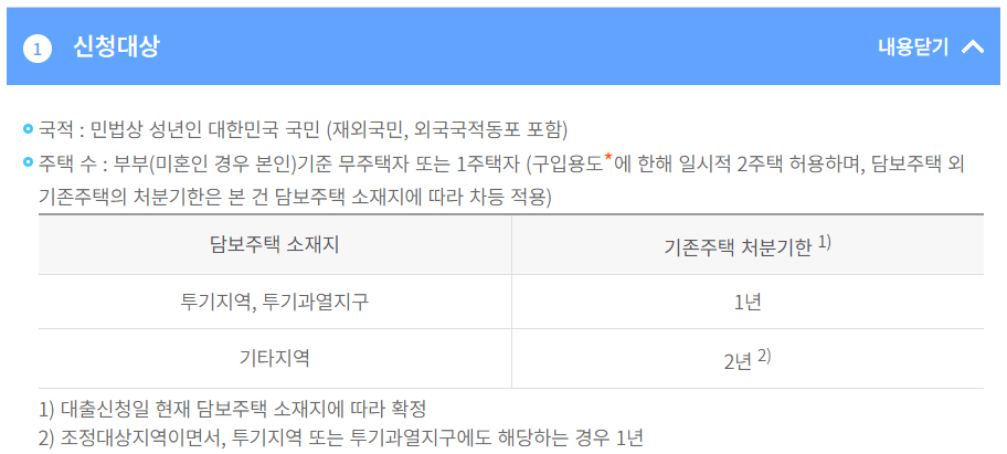 1. 대한민국 국민으로 무주택자 또는 1주택자(기존 주택을 처분하고 새로운 주택을 매수하려 하는 자)