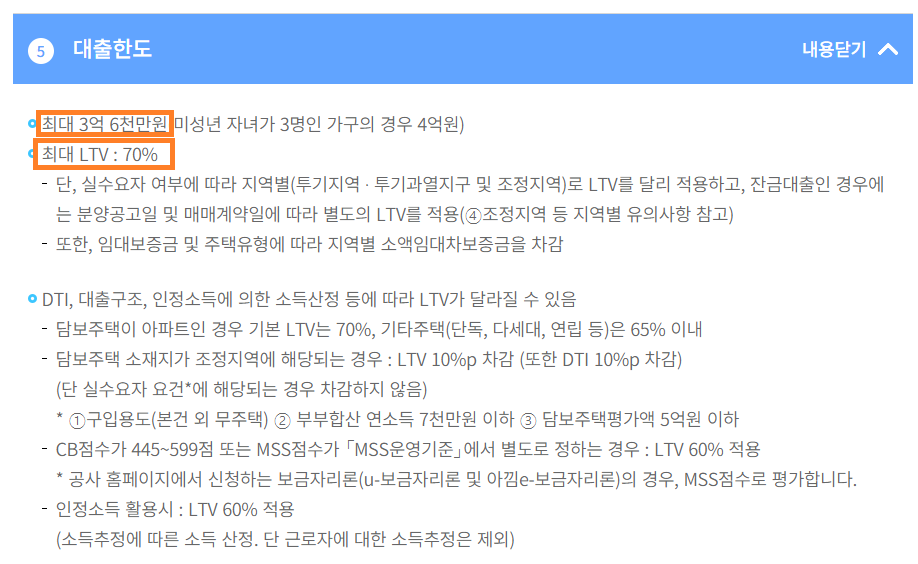 3. LTV는 70%까지 가능할지라도 대출한도는 최대 3억 6천만원(미성년 자녀가 3명 이상일 경우 4억 원)까지만 대출 가능