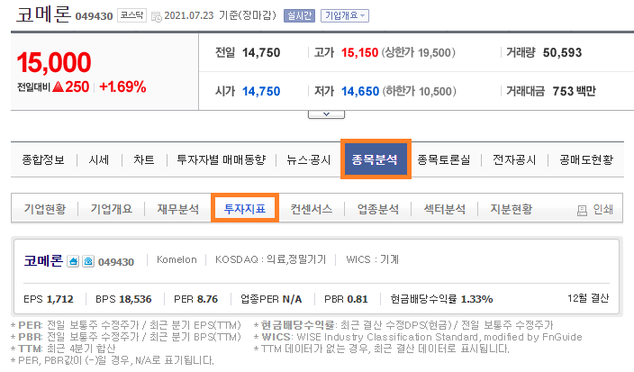 [종목분석] - [투자지표] 메뉴를 클릭하여