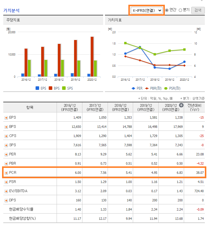 [K-IFRS(연결)]로 바꾸어 놓고 아래로 살짝 내리면 주가현금흐름비율(PCR)를 확인할 수 있습니다.