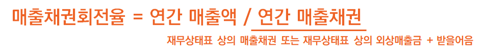 손익계산서에 있는 연간 매출액을 재무상태표에 있는 연간 매출채권(매출채권 또는 외상매출금+받을어음)으로 나눈 수치가 매출채권 회전율이라고 생각하면 됩니다.
