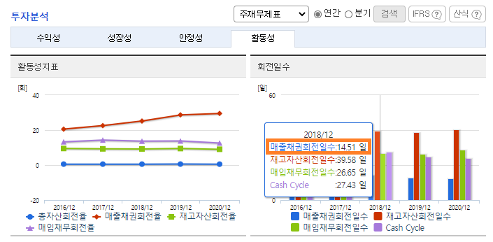아래로 살짝 내려 [주재무제표] - [활동성]을 클릭한 후 오른쪽 그래프에 마우스를 가져가면 자동적으로 매출채권회전일수를 확인할 수 있습니다.