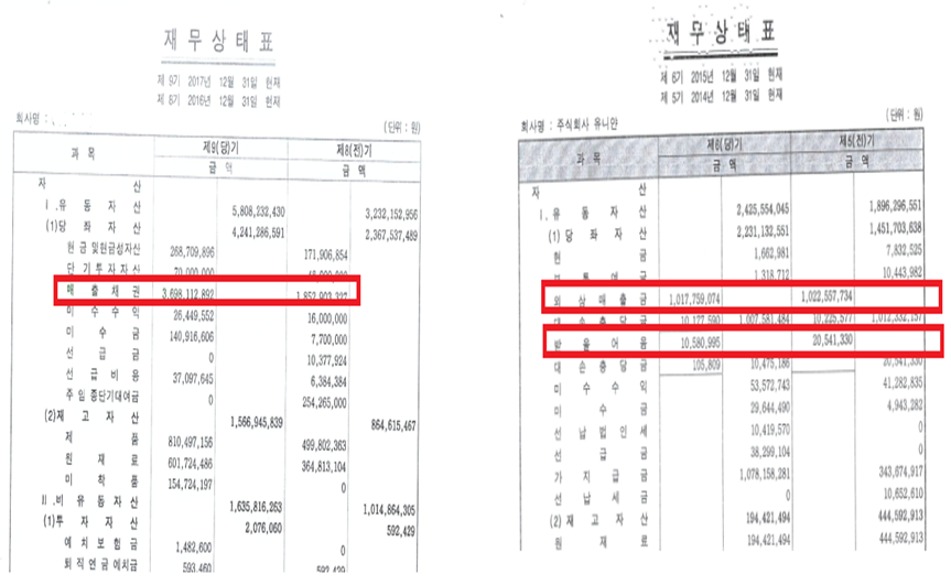 왼쪽에 있는 재무상태표에는 '매출채권'이라는 계정으로 나타냈습니다. 그리고 오른쪽에 있는 재무상태표에는 '외상매출금' 계정과 '받을어음' 계정으로 구분하여 나타냈습니다. 이런 방식으로 기업들은 각자의 방식으로 매출채권을 재무상태표에 나타내고 있다는 것을 알고 있으면 될 것 같습니다.