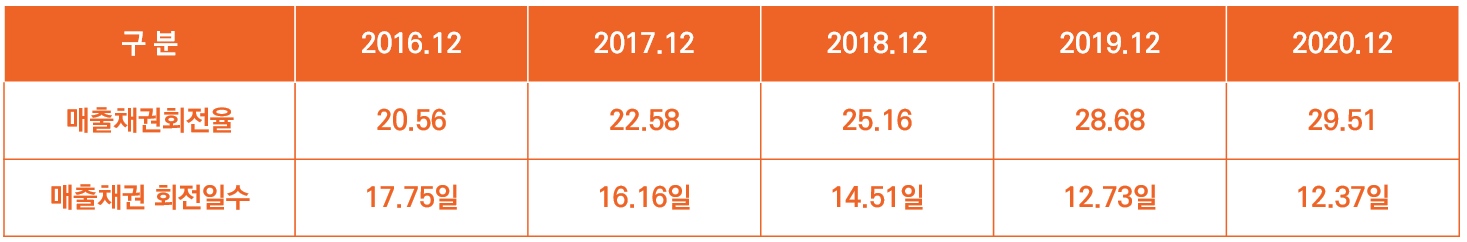 매출채권회전율과는 반대로 회전일수가 낮을수록 매출채권이 현금으로 회수되는 속도가 빠르다는 의미이기 때문에 연도별 매출채권회전일수 확인하여 기간이 짧을수록 기업의 현금 회수율이 좋아지고 있다는 의미로 해석할 수 있습니다.