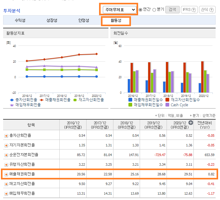 아래로 살짝 내려 [주재무제표] - [활동성]을 클릭하면 매출채권회전율를 확인할 수 있습니다.