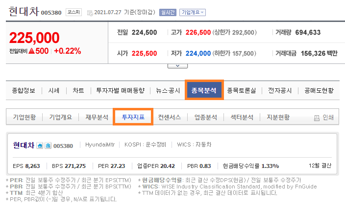 [종목분석] - [투자지표] 메뉴를 클릭하여
