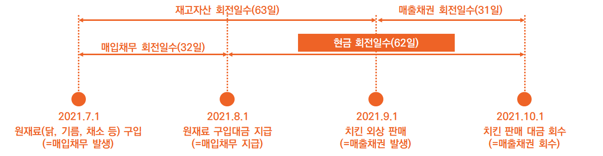 그리고 원재료를 가지고 오기 위해 현금을 투입한 날이 8월 1일이고, 치킨 500마리에 대한 판매대금이 들어온 날이 10월 1일이므로 원재료를 가지고 와서 현금을 회수하는 데까지 걸리는 시간은 62일(8월 1일~10월 1일)이 됩니다. 그리고 이 기간을 바로 '현금회전일수(현금전환주기, Cash Conversion Cycle)'라고 합니다. 결국 현금이 회수되는 데까지 62일이라는 시간이 걸렸다는 의미입니다.