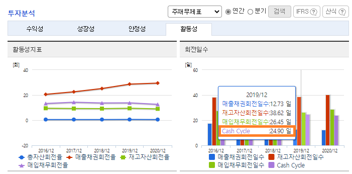 아래로 살짝 내려 [주재무제표] - [활동성]을 클릭한 후 오른쪽 그래프에 마우스를 가져가면 자동적으로 현금회전일수(현금전환주기)를 확인할 수 있습니다.(Cash Cycle이라고 표시된 항목)