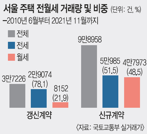 2020년 7월 말 새 임대차법이 시행될 때만 해도 ‘월세화’는 여전히 논란의 대상이었다. 당시 임대료를 직전 계약액의 5%를 초과해 인상할 수 없게 한 전월세상한제가 우선 시행됐다. 이로 인해 집주인은 전세보증금을 통해 은행에서 거두던 이자 수익이 비교적 제한됐다. 업계에서는 집주인이 계약을 월세로 전환하거나 월세 비중을 올려서 세입자에게 부담을 전가하리라는 예상이 나왔다. 반면 한국에서는 사실상 주택마련 자금 지렛대와 사금융 역할까지 도맡는 전세 제도가 쉽게 사라질 리 없다는 의견도 팽팽히 맞섰다.