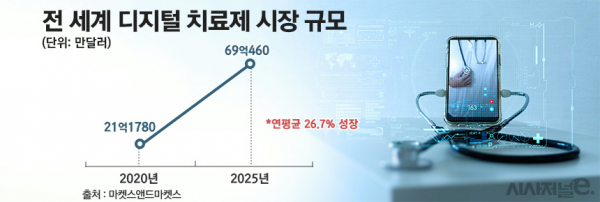 디지털치료제는 소프트웨어 의료기기를 활용해 질병을 치료하고 건강을 향상시킬 수 있는 솔루션이다. 디지털치료제가 다루는 질병 범위도 통증, 당뇨병, 외상 후 스트레스 장애, 천식, 마약중독 등으로 확대되고 있다. 시장조사 업체 마켓스앤드마켓스에 따르면 전 세계 디지털 치료제 시장은 2020년 21억1780만달러에서 2025년 69억460만달러로 연평균 26.7% 성장할 전망이다.