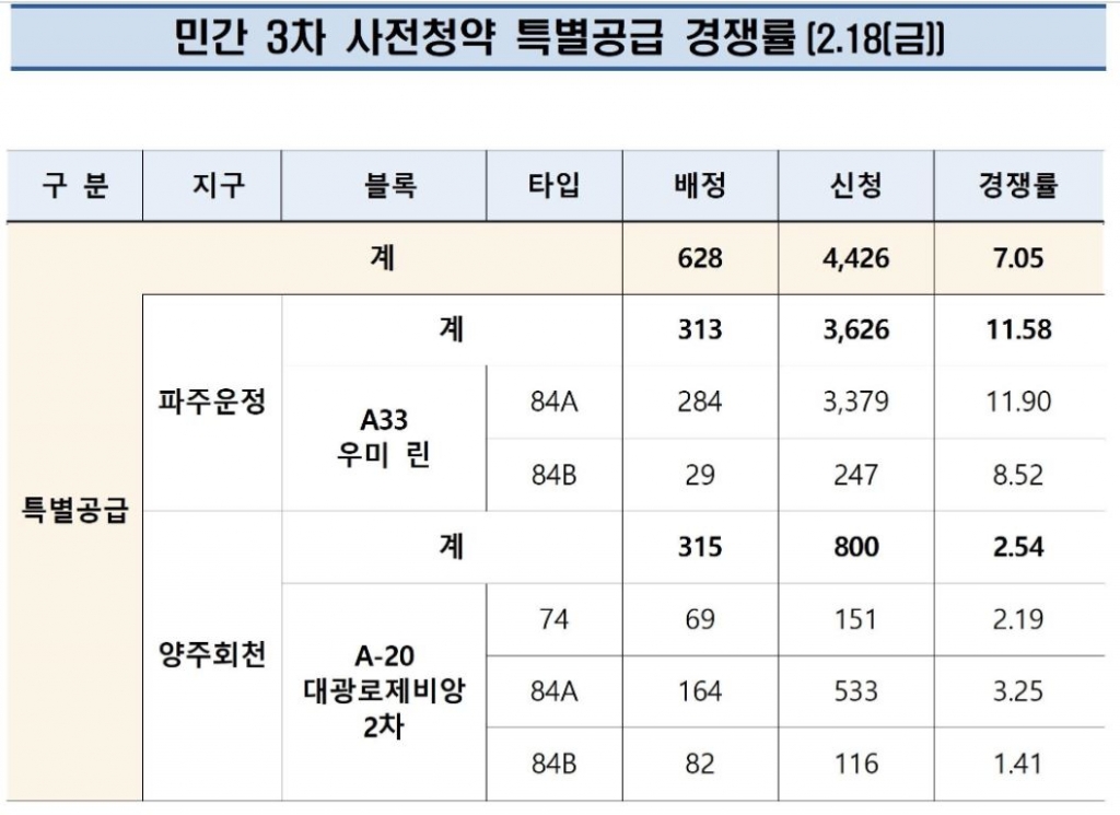 3차 민간 사전청약 특별공급 경쟁률이 7.05대 1로 마감됐다. 18일 한국부동산원 청약홈에 따르면 이날 민간 사전청약 3차 특별공급 접수 마감 결과 2개 지구, 총 628가구 ...