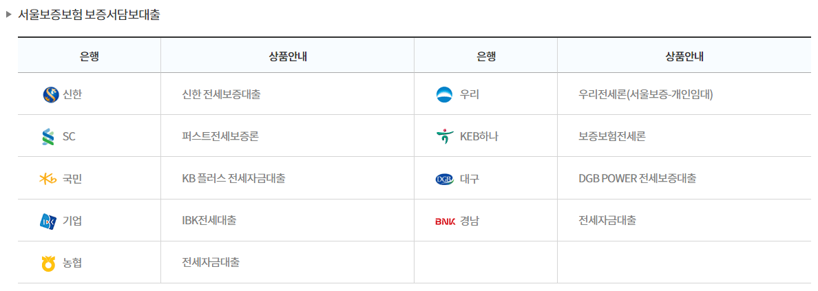 HUG주택도시보증공사가 보증해 주는 전세대출 상품은 '전세금안심대출보증' 입니다. 하지만 SGI서울보증의 경우 은행마다 상품의 이름이 각각 다릅니다. 금융소비자 정보포털 파인(링크 참고)에 따르면 각 은행마다 가지고 있는 상품을 확인할 수 있습니다.