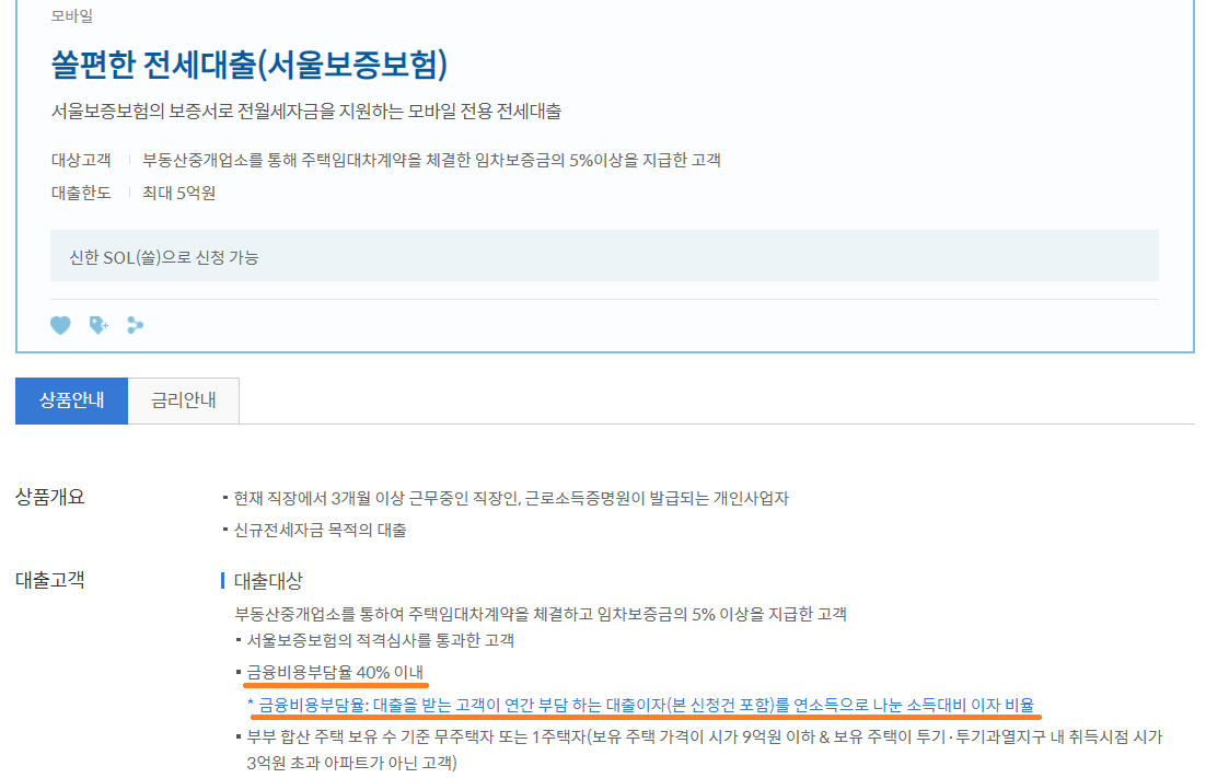 쉽게 이야기해 차주(대출받는 사람)의 연소득 대비 대출이자가 40% 이내의 범위에서만 대출을 받을 수 있다는 의미입니다. 일단은 대출이자를 제대로 상환하는 것이 SGI서울보증 입장에서는 중요하다고 생각하는 것 같습니다. 보다 쉽게 이해하기 위해 예시를 통해 살펴보겠습니다.