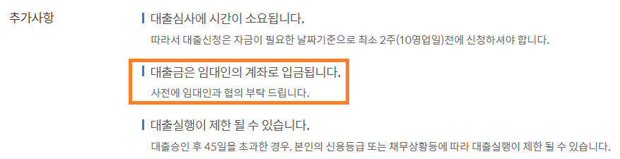 해당 대출금은 임대인의 계좌로 입금되는 만큼 당연히 임대인의 동의가 필요합니다. 때문에 해당 대출을 꺼리는 임대인도 있다고 합니다. 하지만 임차인과의 원만한 관계 형성 등을 위해서는 기관에서 연락이 올 경우 당황하지 않고 흔쾌하게 동의해 주는 것이 좋은 임대인이 아닐까 싶습니다.