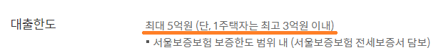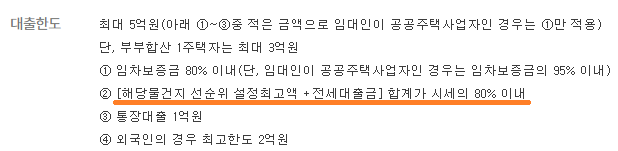전세보증금의 80% 이내라고 되어 있으니 일단은 최대 5억원까지 원칙적으로 가능하다는 의미입니다. 하지만 1주택자의 경우 3억 원을 초과할 수 없다고 되어 있습니다.