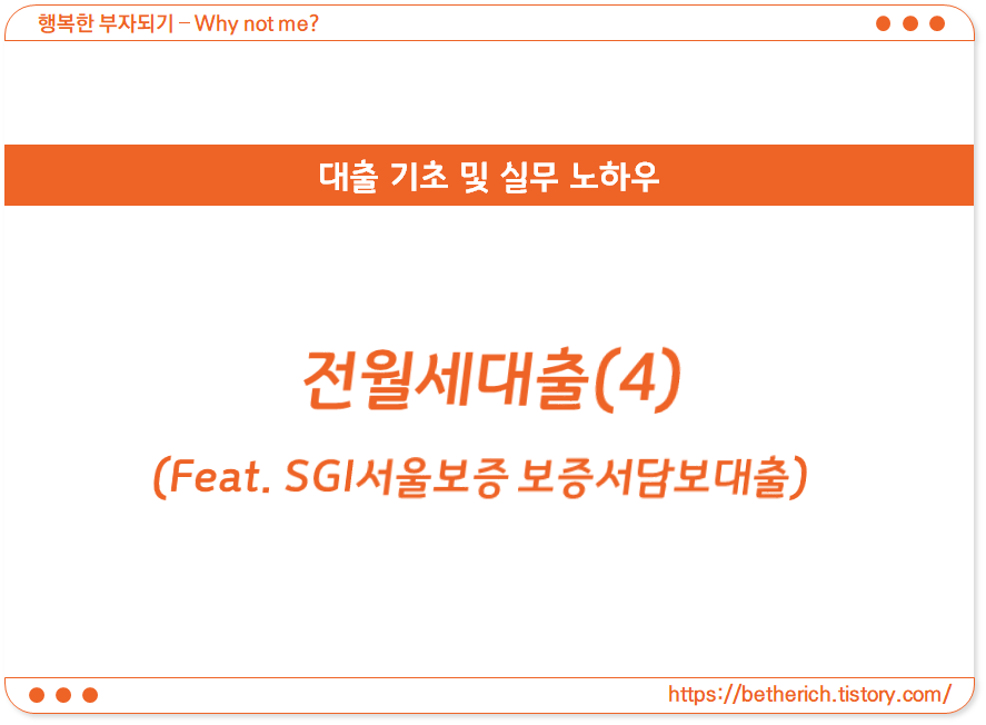 앞서 전세대출은 '보증기관의 보증서'를 담보로 대출해 주는 담보대출이라는 것을 공부했습니다. 그리고 '보증기관'은 크게 HUG주택도시보증공사, SGI서울보증, 한국주택금융공사 등이 있음을 확
