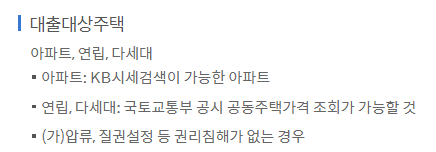 그리고 주택의 종류로는 아파트, 오피스텔, 연립주택, 다세대주택 등이 가능하며, 시세 조회가 가능한 곳이어야 합니다.