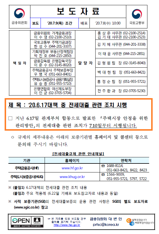 아울러 금융위원회에서 2020년 7월 9일 발표한 보도자료 '20.6.17 대책 중 전세대출 관련 조치사항'을 살펴보겠습니다. 이렇게 나와 있습니다.