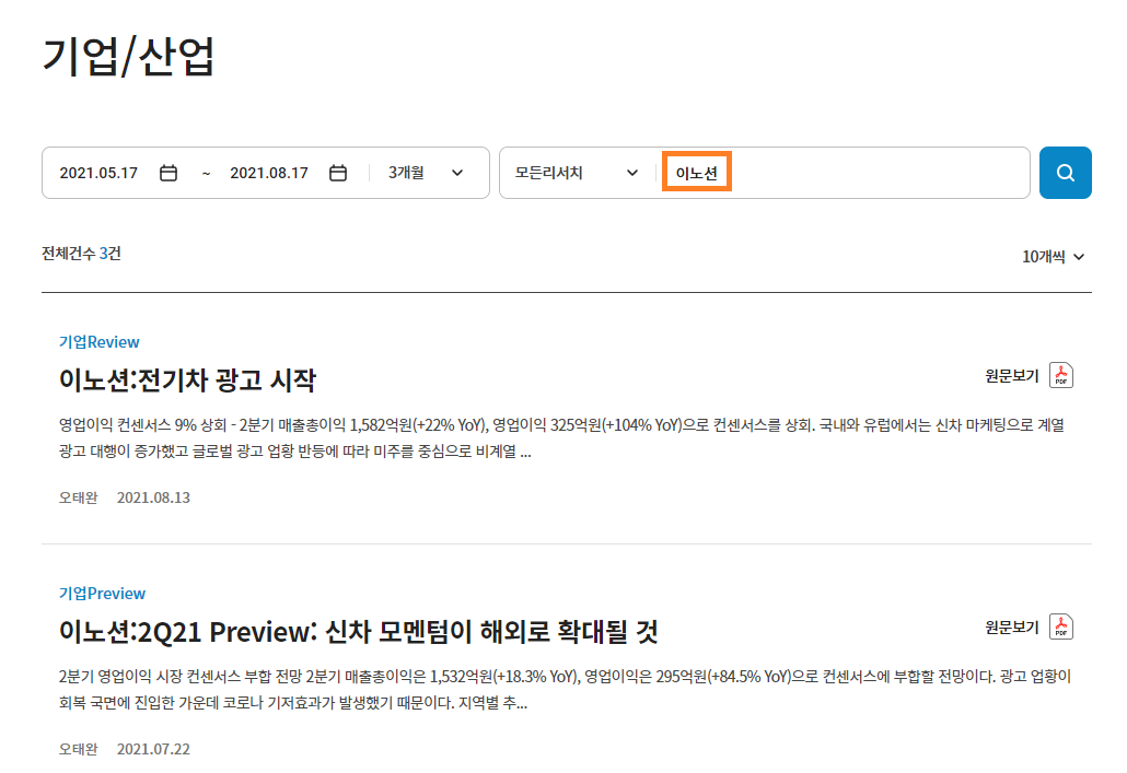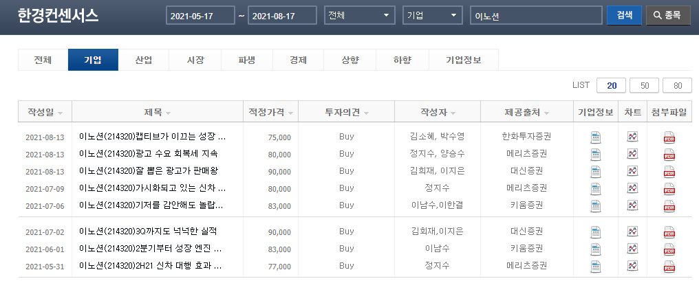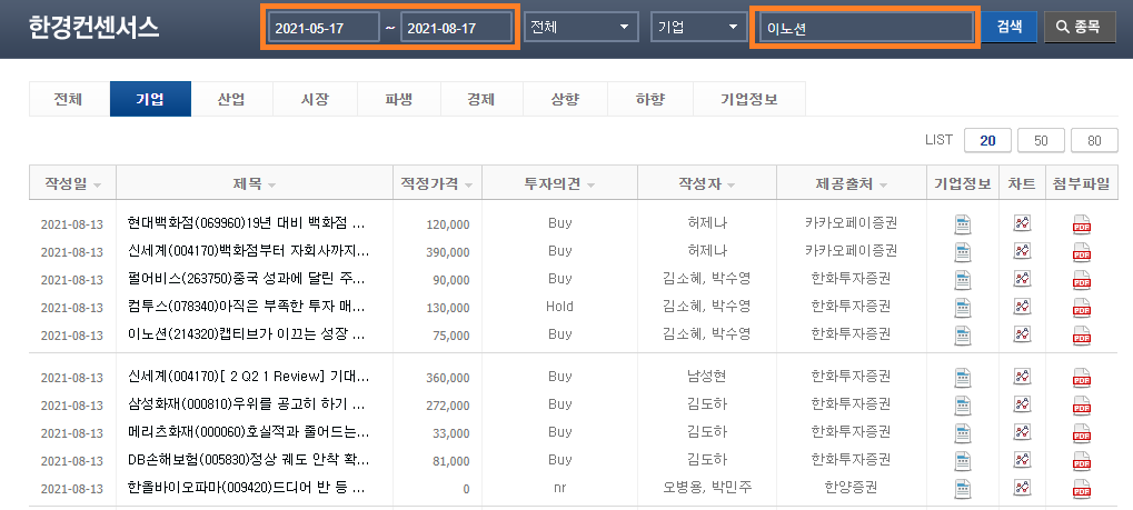 3) 찾고자 하는 기업에 대한 해당 기간에 발행된 주식 애널리스트 리포트들을 확인할 수 있습니다.