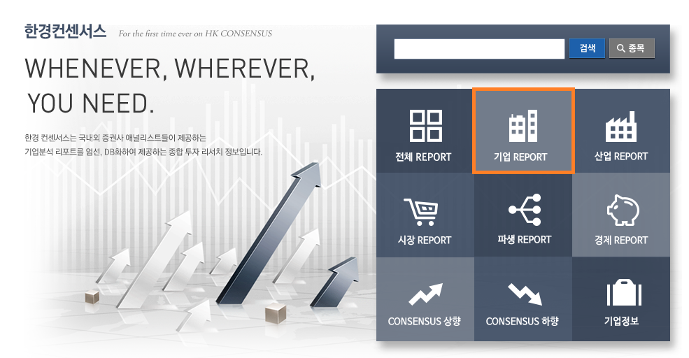 1) 홈페이지 접속 후 관심 기업에 대한 주식 애널리스트 리포트를 찾기 위해 '기업 REPORT'를 클릭합니다.