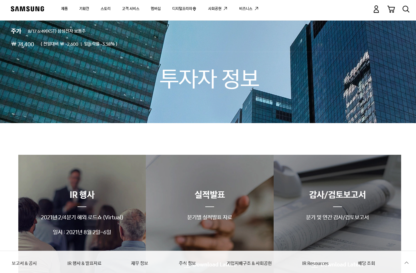 주식 투자를 할 만한 기업에 대하여 알아보는 방법은 많이 있습니다. 당연하겠지만 가장 쉽게 알아볼 수 있는 방법은 기업 홈페이지를 통해 검색해 보는 것입니다. 예를 들어 '삼성전자'에 대하여 알아보고 싶을 경우 삼성전자 홈페이지 접속 후 [비즈니스] - [투자자 정보] 메뉴를 통해 투자와 관련된 다양한 정보들을 확인할 수 있습니다.(아래 링크 참고)