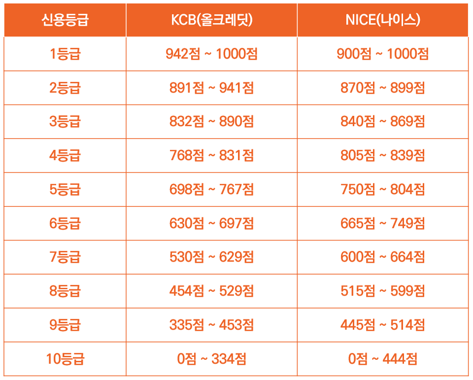 그렇다면 기존의 신용등급 조회 방식과 현재 신용점수 조회 방식이 어떻게 매칭되는지 알아보겠습니다. 기존 신용등급이 현재 신용점수로 대략 몇 점 정도인지를 판단해 볼 수 있을 것 같습니다. 전월세대출에 대하여 공부하면서 신용평가기관이 2개(올크레딧, 나이스지키미)가 있다는 것을 알게 되었고 기존 신용등급이 신용평가기관 신용점수에 어떻게 매칭되는지는 아래 표를 통해 확인할 수 있습니다.