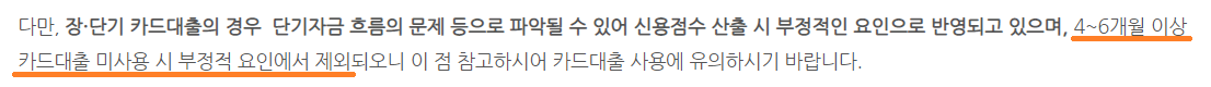 하지만 카드대출, 현금서비스는 신용점수 산출에 부정적인 요인으로 반영된다고 합니다. 때문에 만약 카드대출, 현금서비스를 받은 적이 있다면 상환한 후 적어도 4~6개월 정도는 대출을 받지 않아야 신용점수가 올라갈 수 있다고 합니다. 나이스지키미 Q&A, 금융감독원의 개인신용평가 민원동향 및 주요 민원사항 Q&A(링크 클릭)에 다음과 같이 명시되어 있습니다.