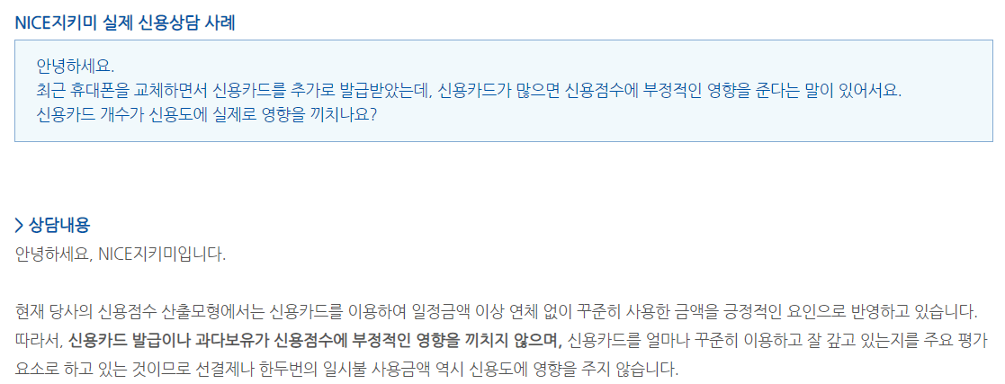 신용카드를 많이 보유하고 있으면 신용점수에 부정적인 영향을 준다는 말을 들어본 적이 있습니다. 그리고 나에게 맞는 혜택을 주는 신용카드를 발견하거나, 은행에 있는 지인이 신용카드를 만들라고 권유하거나 새 핸드폰을 구입할 경우 신용카드 우대혜택을 제공한다고 할 때 '내 신용점수가 낮아지는 것 아니야?'라고 생각했던 적이 있습니다. 때문에 가지고 있던 신용카드들을 모두 해지하고 1개 정도만 유지할까 고민하기도 했고, 지인의 부탁을 에둘러 거절했던 적도 있습니다. 하지만 '신용카드를 발급하는 행위, 신용카드 과다보유가 신용점수에 부정적인 영향을 미치지는 않는다'고 합니다. NICE신용점수를 산정하는 신용평가기관 나이스지키미(링크 클릭) Q&A에 따르면 다음과 같이 되어 있습니다.