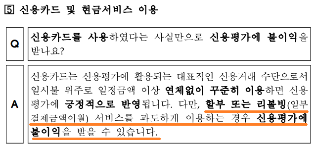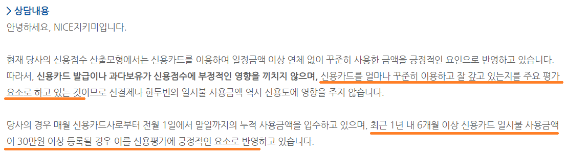 앞서 나이스지키미의 Q&A에서도 '신용카드를 이용하여 꾸준히 이용하고 잘 갚고 있는지'가 주요 평가요소라고 했고, 최근 1년 내 6개월 이상 신용카드 일시불 사용금액이 30만원 이상 등록될 경우 신용평가에 긍정적 요소로 반영한다고 하는 만큼 카드를 안 쓰는 것보다는 연체 없이 꾸준히 사용하는 것이 신용점수를 올리는 데 도움이 된다는 것을 확인할 수 있습니다.