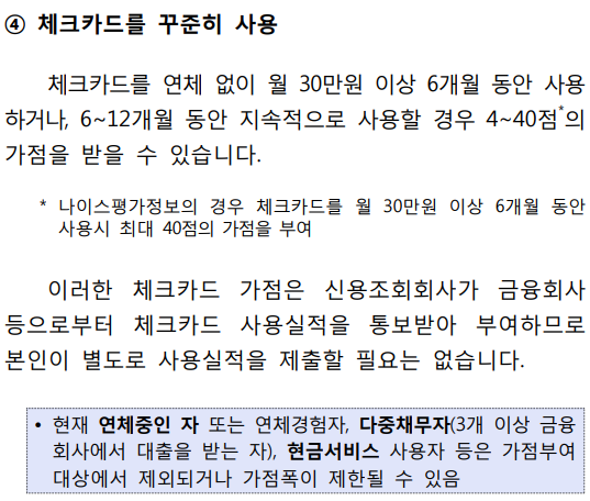 신용카드 사용도 좋지만 체크카드를 병행해서 사용하는 것 또한 신용점수에 긍정적인 영향을 미칠 수 있습니다. 금융감독원에서 정리한 '금융꿀팁 200선- (61) 내 신용등급 올리기 노하우(3) :개인신용평가시 가점 받는 방법(링크 클릭)'에 따르면 체크카드를 연체없이 월 30만원 이상 6개월 동안 사용하거나 6~12개월 동안 지속적으로 사용할 경우 가점을 받을 수 있다고 되어 있습니다.