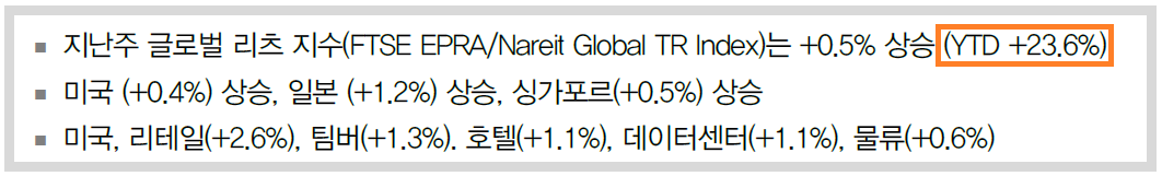 지난주 글로벌 리츠 지수가 0.5% 상승했다고 합니다. 그리고 괄호에는 YTD +23.6%라고 되어 있습니다. 쉽게 말해 지난주에는 0.5% 증가했고, 2021년 초부터 현재까지 23.6% 증가했다는 의미입니다.