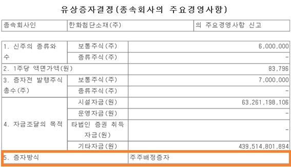 한화첨단소재(주)가 보통주식 6,000,000주를 주주배정증자 방식으로 유상증자하겠다는 공고문입니다.