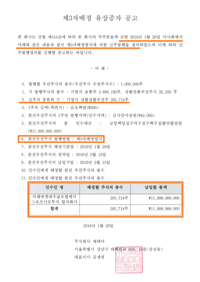 2018.1.26 이사회에서 의결하여 제3자(미래에셋대우글로벌켘이그로쓰사모투자 합자회사)에 주식 285,714주를 증자하겠다는 내용입니다.