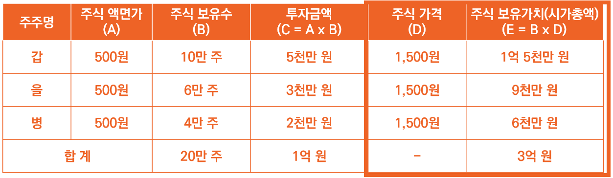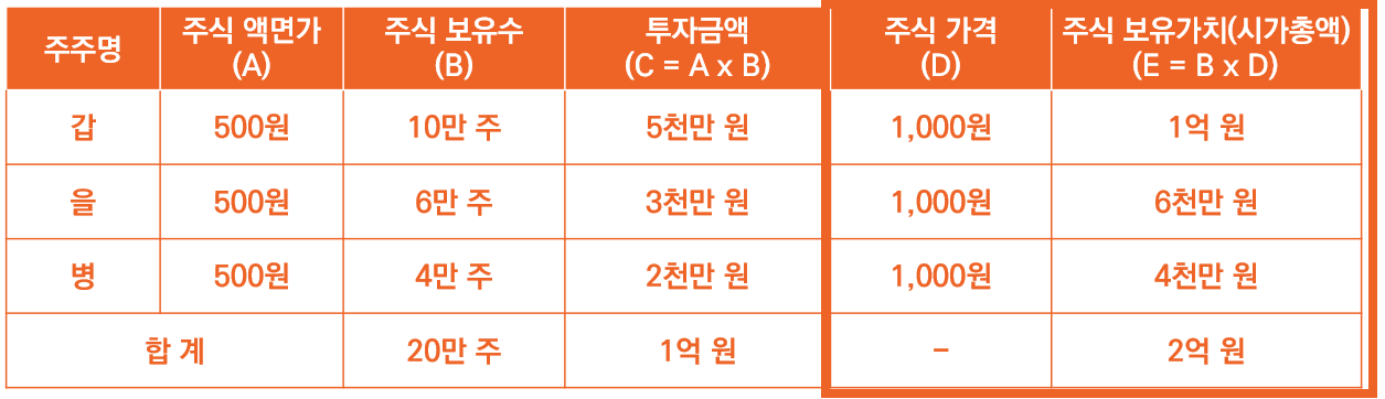 이렇게 되면 갑과 을, 병이 가지고 있는 주식 보유수는 더욱 늘어납니다. 그에 따라 자본금 또한 더욱 늘어나게 되겠지요. 해당 내용을 요약하면 아래 그림과 같습니다.