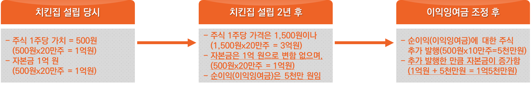 그리고 치킨집 설립 당시와 설립 2년 후 자본을 살펴보면 다음과 같습니다. 설립 당시 들어간 자본금은 1억 원으로 변함이 없습니다. 하지만 열심히 사업을 운영한 결과 5천만 원의 수익을 냈고 해당 금액은 '이익잉여금'이라는 계정으로 들어가 있습니다.