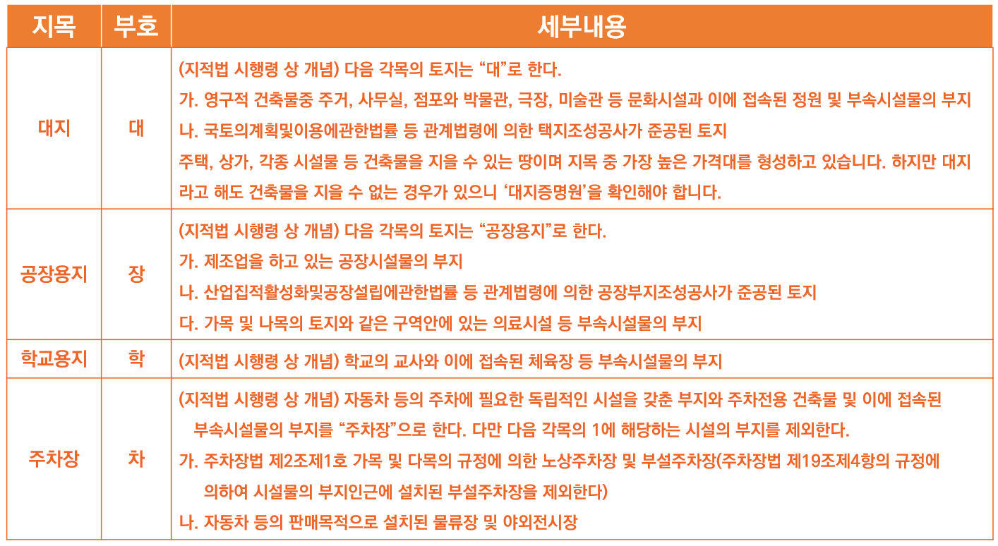 요약하면 지목이란 땅이 현재 어떻게 쓰이고 있는가(토지의 용도)를 땅과 관련된 문서(지적공부)에 등록한 것 정도로 정리할 수 있을 것 같습니다. 예를 들어 땅이 현재 과수원으로 쓰이면 과수원으로, 땅이 현재 주차장으로 쓰이면 주차장으로, 땅이 현재 도로로 쓰이면 도로로 문서에 등록이 되어 있다고 생각하면 되겠습니다.