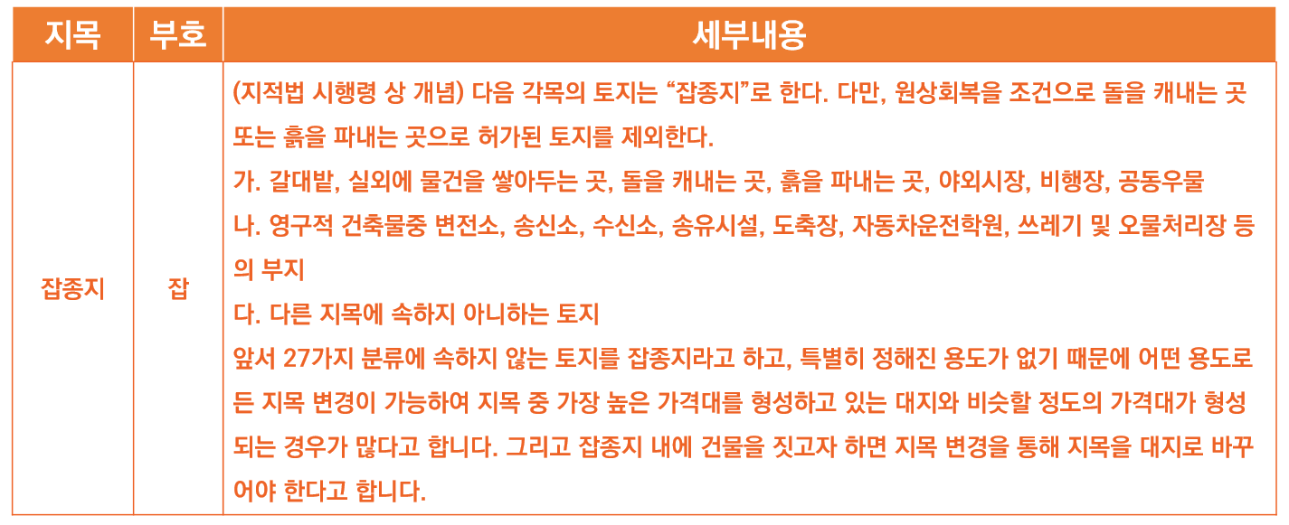 이렇게 총 28개 종류가 있습니다. 그리고 해당 종류를 지적공부에 기록할 때는 지목의 부호를 사용합니다. 쉽게 이야기해서 해당 필지가 잡종지라면 '잡'으로, 종교용지면 '종'으로, 수도용지면 '수'로 기록한다는 의미입니다. 예를 들어 보겠습니다.