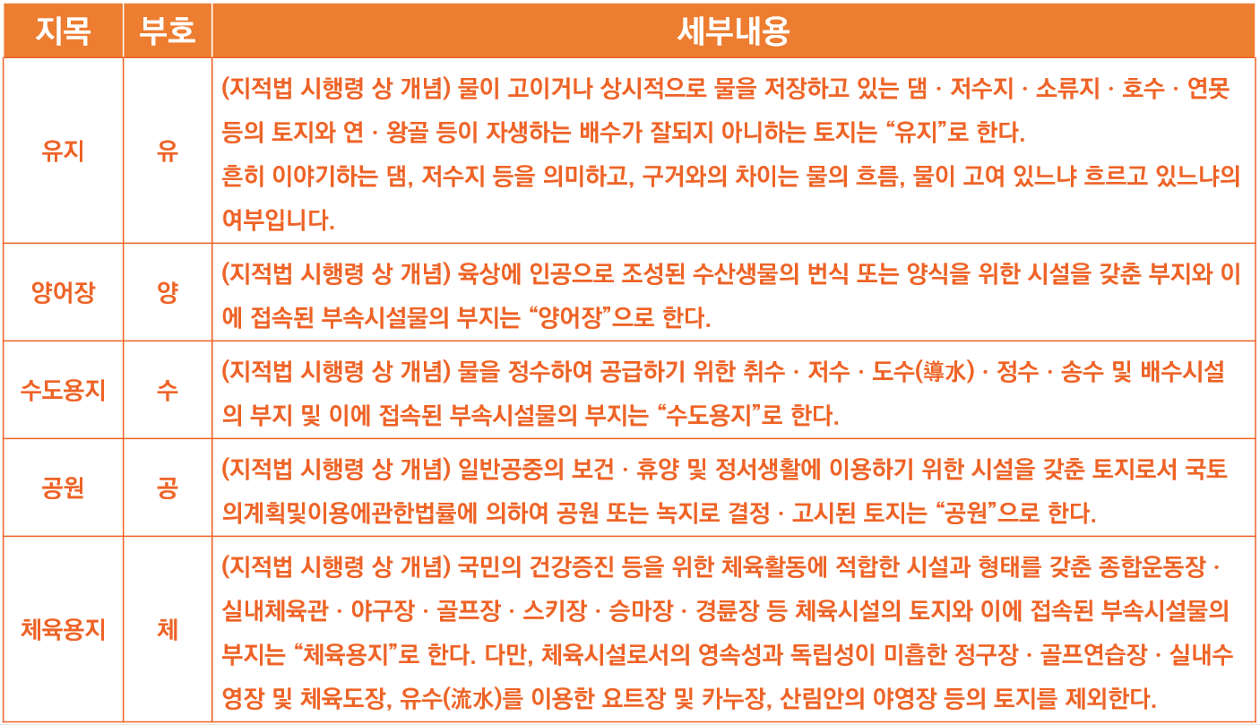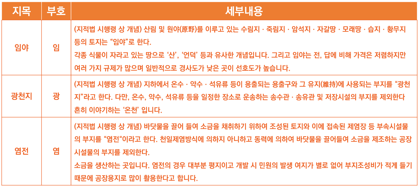 땅이라는 게 이런저런 곳에 참 다양하게 쓰인다는 것을 다시 한 번 확인하였습니다. 지목의 종류 28개를 외울 필요는 없지만 혹시라도 지적공부 등을 보았을 때 '이 땅이 이렇게 쓰이고 있구나' 정도는 알아야 할 것 같습니다.