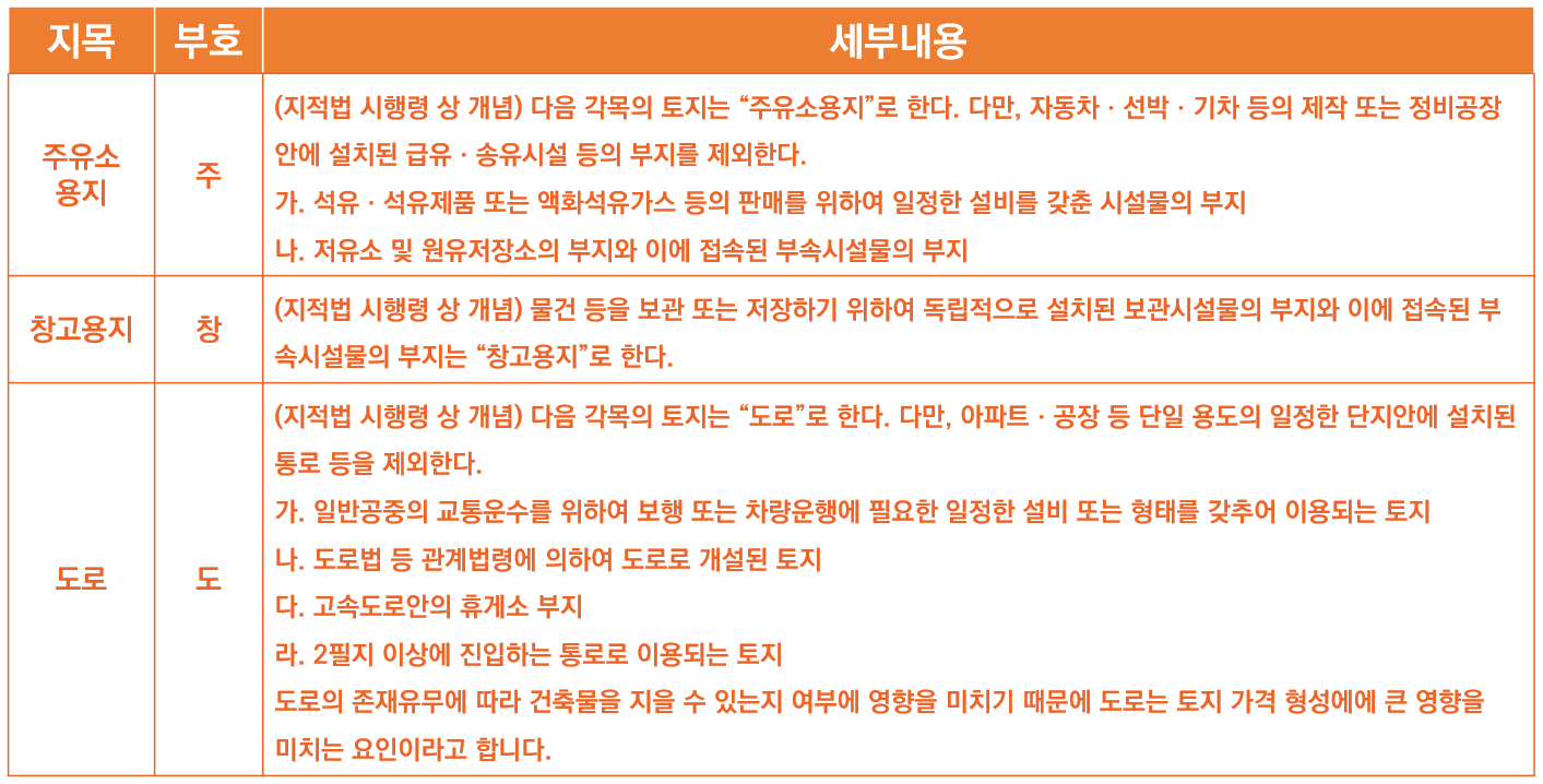 종류가 되게 많습니다. 세어 보니 무려 28가지나 됩니다. 보고 딱 감이 오는 것들도 있지만(도로, 주유소용지, 주차장, 체육용지, 공원 등) 이게 무슨 말인가 하는 것들도 있습니다.(대, 구거, 유지 등)