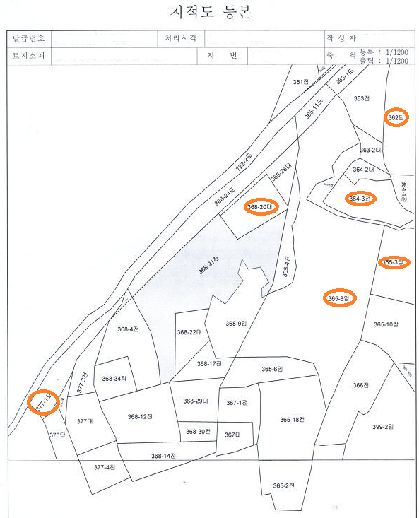 앞서 살펴봤던 지적도 등본입니다. 이 등본을 통해 ①'377-1도'라는 의미는 377-1이라는 필지가 현재 도로의 용도로 쓰인다는 것을 알 수 있고, ②'368-20대'라는 의미는 368-20이라는 필지가 현재 대지의 용도로 쓰이고 있다는 것, ③'365-8임'이라는 의미는 365-8이라는 필지가 현재 임야의 용도로 쓰이고 있다는 것, ④'365-3잡'이라는 의미는 365-3이라는 필지가 현재 잡종지로 쓰이고 있다는 것, ⑤'364-3전'이라는 의미는 364-3이라는 필지가 현재 밭으로 쓰인다는 것, ⑥'362답'이라는 의미는 362라는 필지가 현재 논으로 쓰인다는 것을 각각 알 수 있습니다.