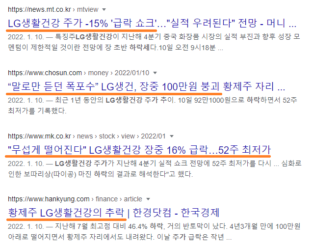 올해(2022년) 초 '우량주', '황제주'라고 불리는 LG생활건강(051900) 주식이 크게 떨어졌던 적이 있습니다. 별다른 생각 없이 주식 현황을 보는데 LG생활건강 주식이 -15% 떨어졌다고 하니 꽤나 충격을 받았었습니다.