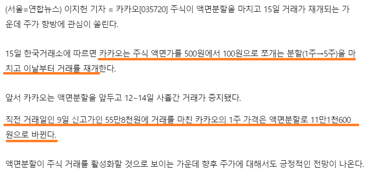 카카오 또한 지난 2021년 4월 5대 1 액면분할을 실시했습니다. 주당 55만 8천원짜리 주식이 액면분할을 통해 11만 1,600원으로 바뀌었다고 합니다.
