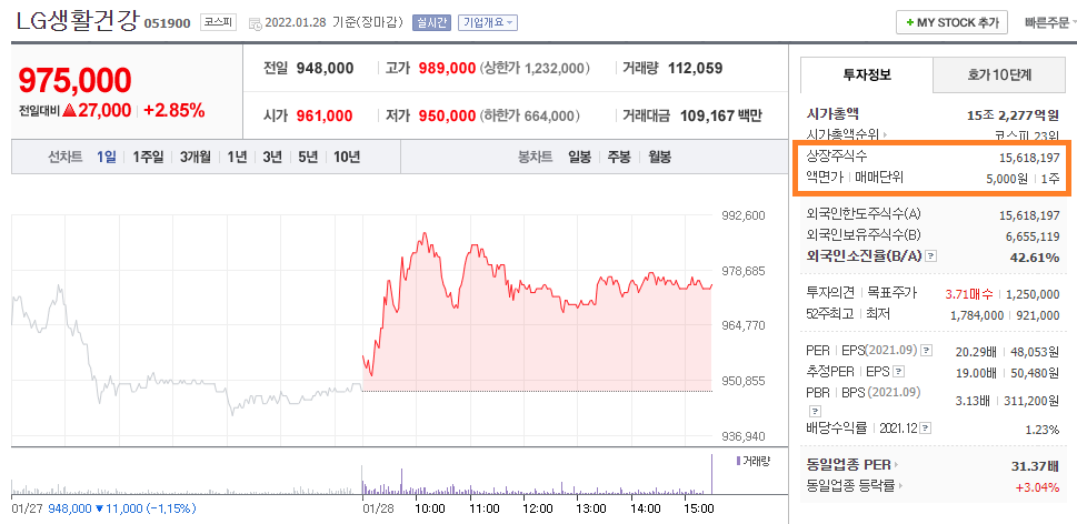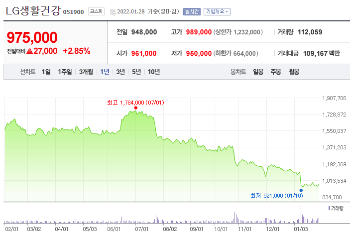 1월 28일 기준 엔씨소프트는 주당 536,000원, LG생활건강은 주당 975,000원입니다. 엔씨소프트는 1년 전 2월 8일 100만원이 넘게 거래가 되었고, LG생활건강 또한 2021년 7월 1일 178만원까지 올라갔습니다. 전고점에 비해 거의 50% 가까이 하락한 상황입니다. 때문에 싸게 나왔다고 생각하면 당장이라도 매수하고 싶지만 문제는 그래도 주당 가격이 너무나 비싸다는 것입니다.