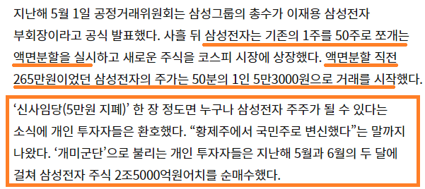 이런 식으로 주당 가격이 높아서 부담스러울 경우 액면분할을 통해 주당 가격을 낮추고 주식거래 활성화를 유도하곤 합니다. 지난 2019년 5월 50대 1 액면분할을 실시했던 삼성전자의 경우 주당 265만원이었던 가격이 5만 3천원이 되었다고 합니다. 이럴 경우 확실히 거래 활성화 효과가 극대화된 것 같습니다.