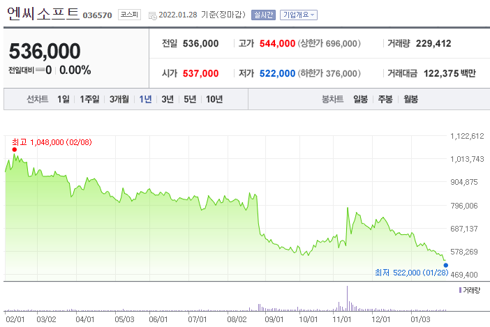 2021년 하반기, 1등 게임주이자 '리니지'로 유명한 엔씨소프트(036570) 주식이 크게 떨어졌던 적이 있습니다. 비록 게임을 하지 않지만 게임주 중에서 1위의 기업으로 알고 있던 만큼 꽤나 놀랐던 기억이 납니다.