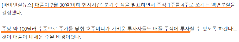 애플도 지난 2020년 8월 4대 1 액면분할을 실시하였고,