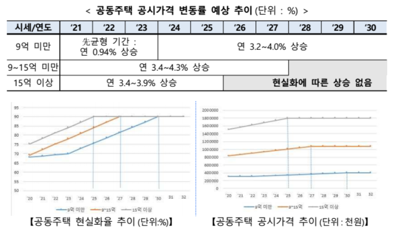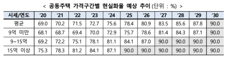 정부가 부동산 공시가격을 시세의 90% 수준까지 현실화하는 방안을 확정했다. 이에 따라 아파트 등 공동주택은 2030년까지 10년간, 단독주택은 2035년까지 15년간점진적으로 공시가격을 올려 현실