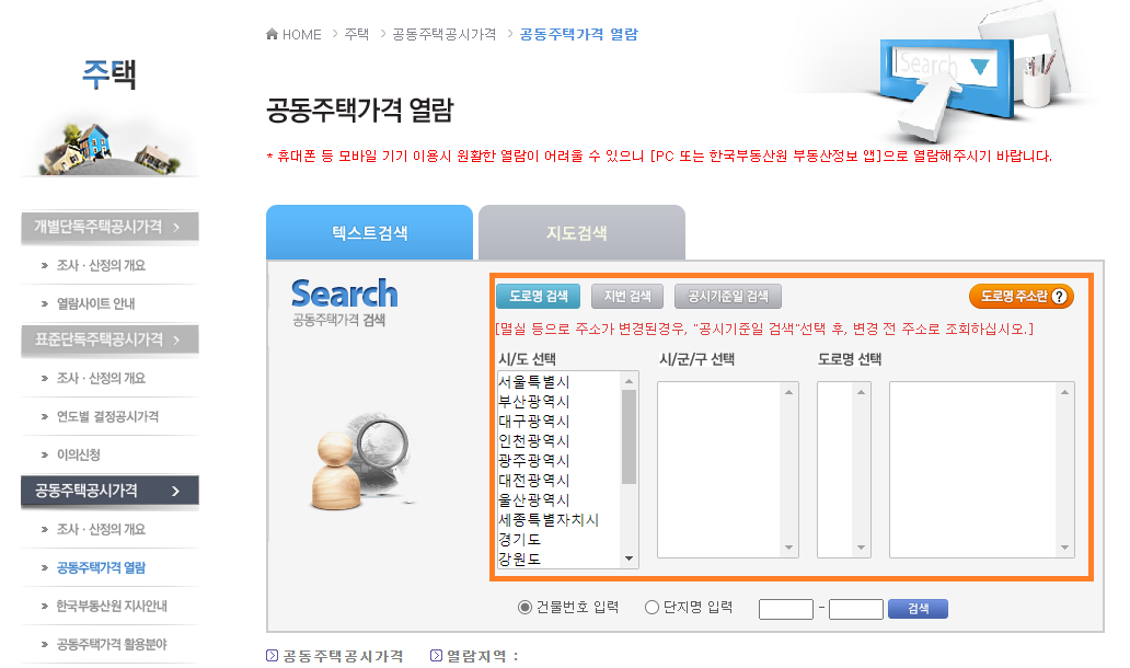 '공동주택 공시가격' 메뉴를 클릭하면 이런 화면이 나옵니다.