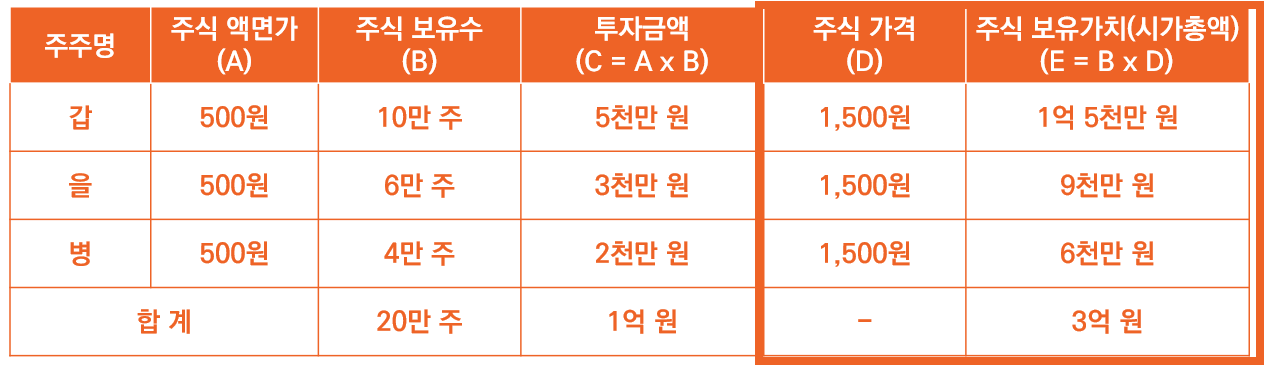 사례) 갑은 오랫동안 눈여겨봤던 상가 건물에 치킨집을 창업했습니다. 창업에 필요한 자본금은 대략 1억 원 정도를 생각했습니다. 보다 '책임감 있고 폼도 나게' 운영하고자 주식회사 형태로 운영하려고 준비했습니다. 주식을 발행할 준비를 했고 액면가 500원에 주식 20만 주를 발행하여 자본금 1억 원을 마련하기로 협의했습니다. (500원 x 20만주 = 1억 원) 그리고 갑은 5천만 원을 투자하여 주식 10만 주를 취득(500원 x 10만주 = 5천만 원)했고 투자자 을은 3천만 원을 투자하여 주식 6만 주(500원 x 6만주 = 3천만 원), 투자자 병은 2천만 원을 투자하여 주식 4만 주(500원 x 4만주 = 2천만 원)를 각각 취득했습니다.