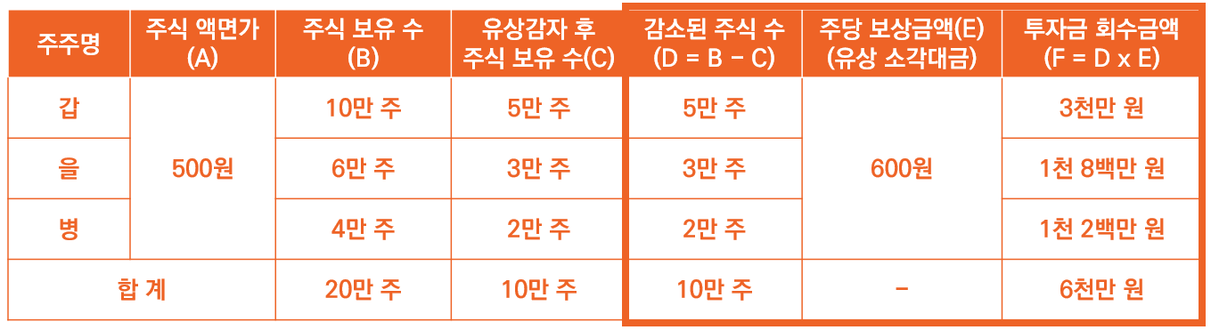 그리고 ② 소각된 주식은 주당 600원으로 보상해 주기로 한 만큼 각자 비율로 소각된 주식만큼 보상을 받아 투자금을 일부 회수하게 됩니다. 그에 따라 갑은 3천만 원, 을은 1천 8백만 원, 병은 1천 2백만 원을 각각 가져가게 됩니다.